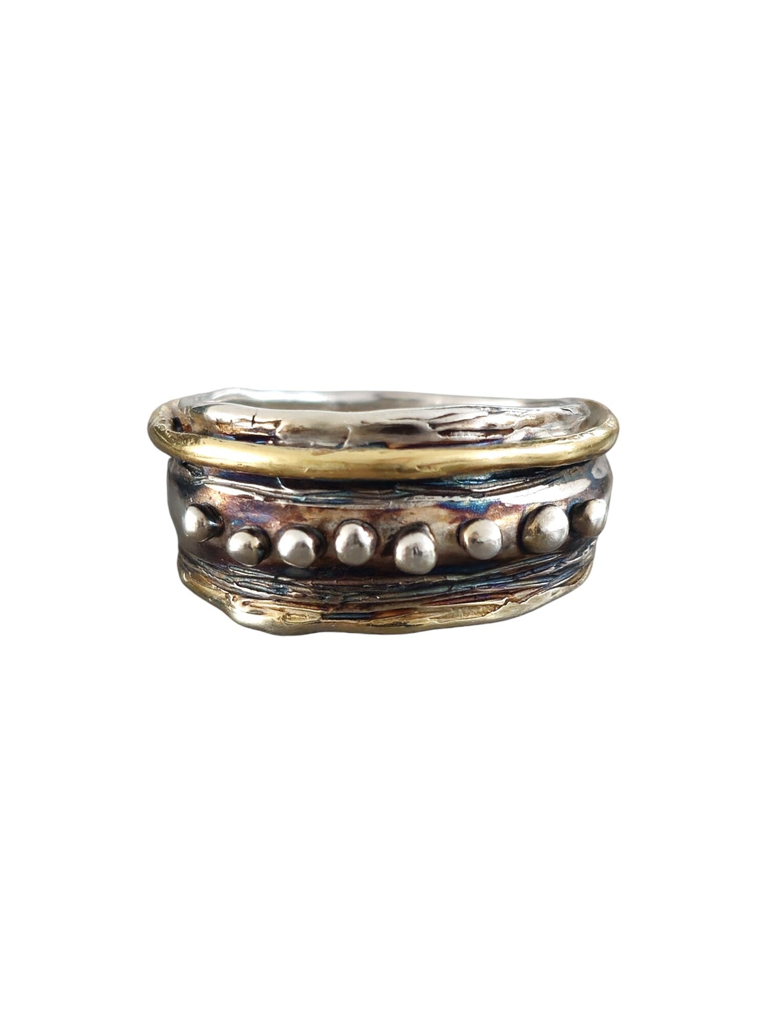 De "Nebula" ring straalt een mystieke elegantie uit. Gemaakt van zilver 925. De unieke details, zoals de zilveren bolletjes en goudkleurige details geven de ring een vintage en artistieke uitstraling. Een perfect accessoire voor wie een gedurfd statement wil maken.